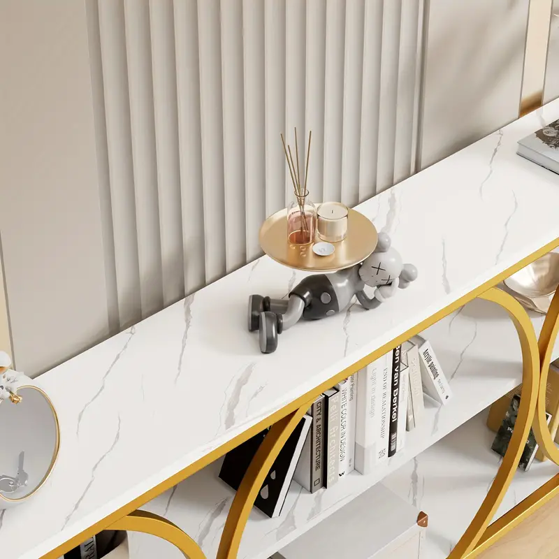 The 70.8″ Gold Console Table is the perfect addition to any modern home, combining style, functionality, and durability. With a sleek gold metal frame and a white faux slate tabletop, this table adds a luxurious touch to entryways, hallways, or living rooms. Its narrow design fits seamlessly in compact spaces, while the three-tier structure provides ample storage and display options for books, décor, or daily essentials.