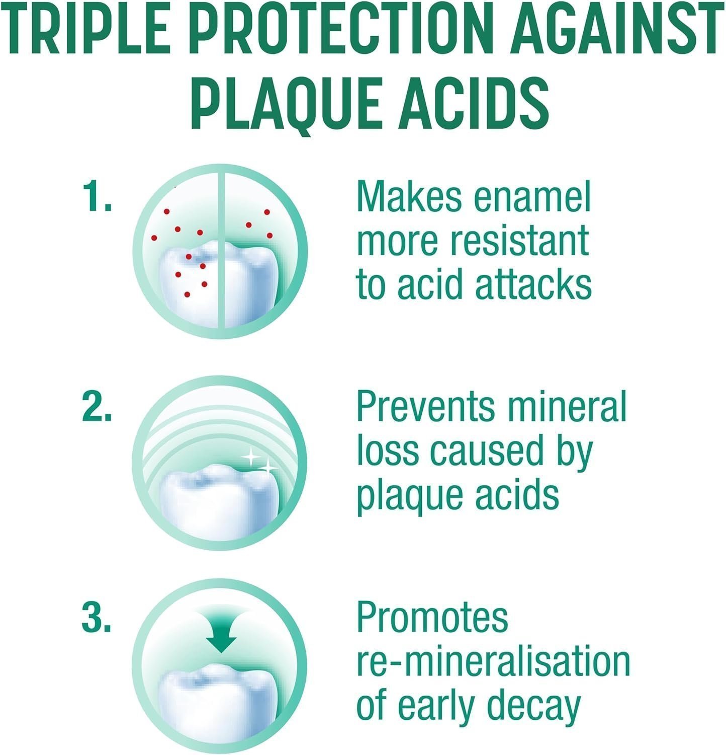 - Contains fluoride to make enamel more resistant to acid attacks, prevent mineral loss and promote remineralisation of early decay