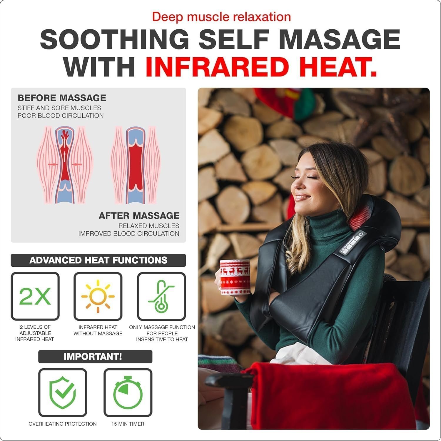 - Advanced Smart Heat Technology – Carefully designed optimal temperature and 2 levels of infrared heat intensity will warm your muscles, allowing you to stretch. It is a great way to instantly relieve pain and get rid of knots in the back and neck area with this neck massager with heat
