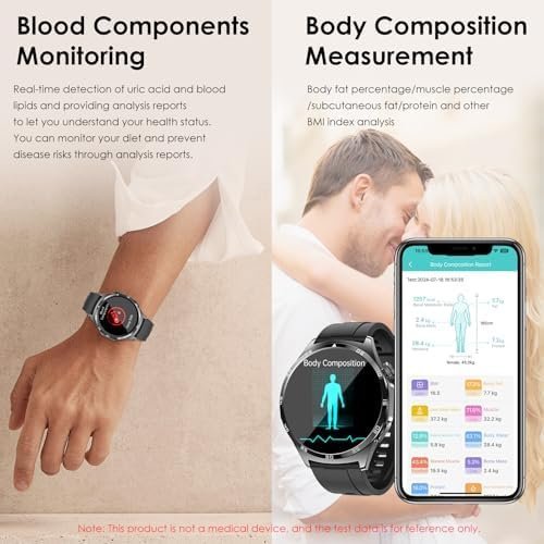 - Health Monitoring 24/7: Thanks to optical cardiac frequency sensors and advanced algorithms, this smart watch with ecg monitor your heart rate, SPO2, blood ρressure, uric acid and blood lipids in real time. It also provides stress testing, respiratory exercise, sleep monitoring, body temperature measurement and body composition analysis. Note:Data is used only for information and does not replace professional medical equipment.