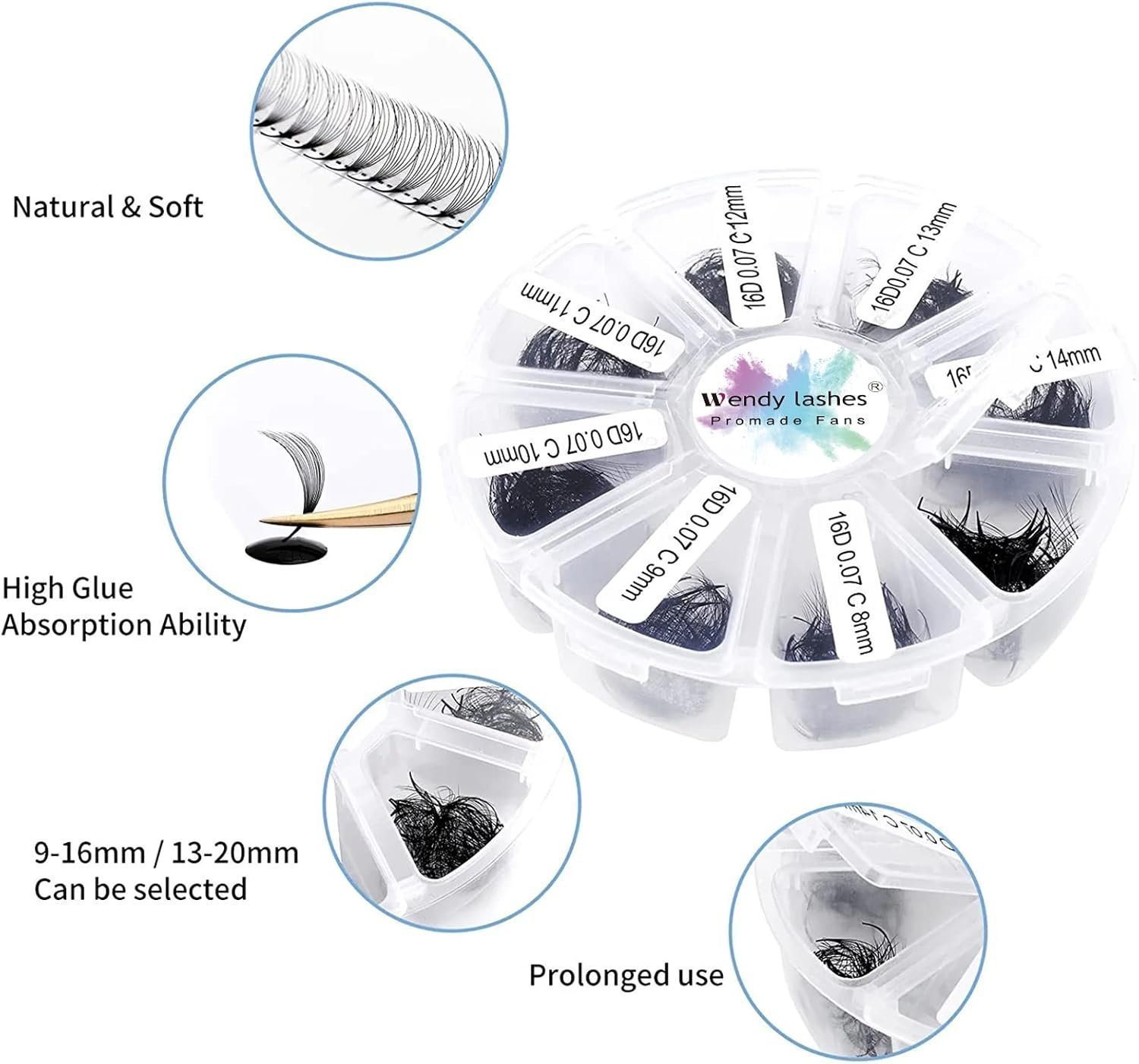 - 1.WendyLashes Pre Made Fans: 500pcs premade fans eyelash extension, 16D 0.07 D Curl 9-16mm. Our premade loose fans provide natural looking curls which help your clients to augment their eyelashes. This easily stands among the best things you can do to help them achieve a truly stunning appearance.