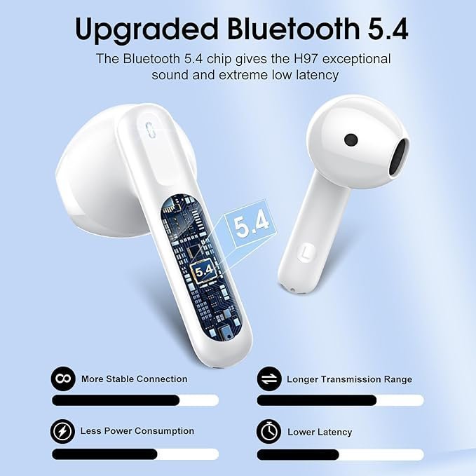 - Immersive Hi-Fi Sound and Crystal Clear Call: Our wireless headphones are equipped with 14mm high-efficiency speakers, which make the bass more punchy and the midrange full and textured, so stereo sounds are crisp, clear, and balanced. In addition, H97 wireless earbuds also adopt ENC noise-canceling technology, which effectively separates your voice from the ambient sound, and makes communication clear. Whether you’re indoors or outdoors, you can enjoy a rich musical experience or clear, uninterrupted calls.
